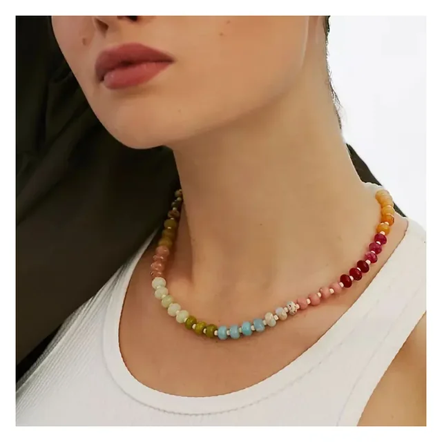 Zooying Adjustable Summer Rainbow Necklace Multicolor Simulated Stone Beads Boho Layered Jewelry